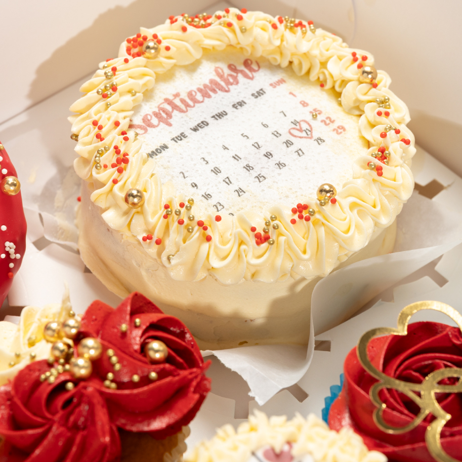 • Mini cake de dos porciones con calendario y mensaje sorpresa (con un encendedor puedes prender el papel de arroz para ver el mensaje sorpresa que tiene la torta)